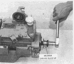 When it becomes necessary to remove the fuel transfer pump from the fuel injection pump housing, the 4N2954 Drive Sleeve on the fuel injection pump camshaft must be removed. Any time the drive sleeve is removed from the camshaft, a new drive sleeve must be installed. The camshaft has serrations (splines) that cut grooves into the drive sleeve when it is installed, to give a positive drive. If a formerly used drive sleeve is installed again, it can slip (slide around) on the camshaft.
