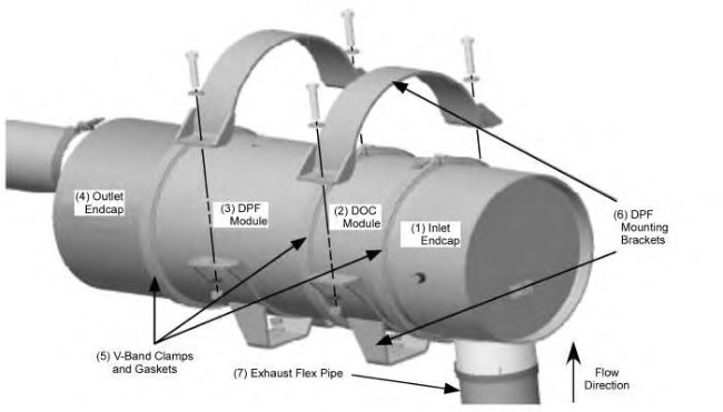 - Do not use the mounting brackets on the Inlet and Outlet end caps. Doing so will cause the end cap-DPF/DOC joint to fail.