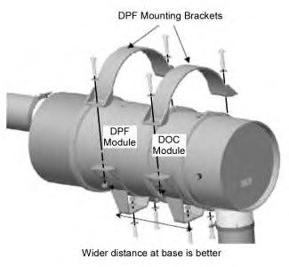 - Do not attach the DPF system rigidly to both the engine and the chassis. Exposing the DPF assembly simultaneously to both engine and chassis vibrations will cause failures. Installing the DPF assembly rigidly to the chassis/frame and isolate the engine vibrations is recommended. In tracked machine applications, chassis vibration isolation is also recommended.