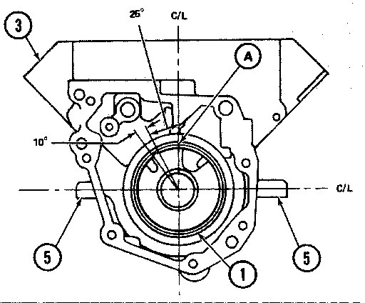1. Use bosses (4) on 4 or 6 cylinder pump housing (2), and bosses (5) on V8 cylinder pump housing (3) to find the vertical and horizontal centerlines of the bearing bore.