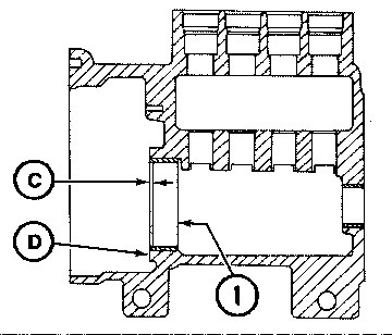 (4) Install bearing (1) into the bore so dimension (C) [dimension from outer edge of bearing to face (D) of pump housing] is 0.114 ± 0.025 (.0045″ ± .0010″).