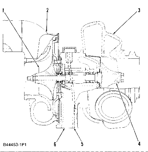 The bearings for the turbocharger use engine oil for lubrication. The oil comes in through the lubrication inlet passage (5) and goes through passages in the center section for lubrication of the bearings. Oil from the turbocharger goes out through the lubrication outlet passage (6) in the bottom of the center section and goes back to the engine oil pan.