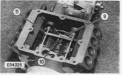 8. Loosen the bolts that hold crossover levers (8) and (9) and move crossover lever (8) off dowel pin (10).
