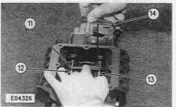 9. Put 5P4209 Gauge (11) on shafts (12) and (13), put crossover lever (9) in a position so dowel pin (10) will fit in gauge hole. Hold 5P4209 Gauge (11) down and torque the bolt that holds crossover lever (9) to 2.8 ± 0.2 N·m (24 ± 2 lb in).