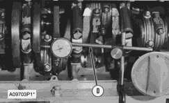 10. Check the crankshaft end play with Tooling (D). The end play is controlled by the thrust bearing on No. 4 main bearing. The end play with new bearings must be 0.08 to 0.25 mm (.003 to .010 in). The maximum permissible end play with used bearings is 0.36 mm (.014 in).
