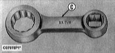 2. Remove the bolts and washers that hold main bearing cap (2) in place. Remove the bearing cap and the lower half of the main bearing. Use Tool (C) to remove the bolts that hold the No. 1 main bearing cap in position.