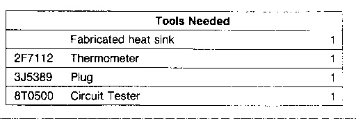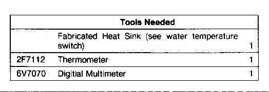 6. Put the heat sink and water temperature switch in water. Use blocks to support the heat sink at surface level. Use a torch to make the water hot and read the temperature on thermometer (1) at which the water temperature switch is closed. Check the specifications for the respective temperatures at which the water temperature switch opens and closes. Let the water temperature go down. The water temperature switch will open when the temperature is 8°C (12°F) lower than the temperature at which the water temperature switch closes.