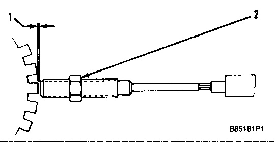 (1) Distance between end of magnetic pickup and gear. (2) Nut.