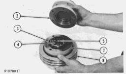 2. Remove hub (2) from pulley (8). Remove and inspect O-ring seal (3). Remove hub (7) from pulley (8). Remove bolts (5) and lock and remove washer (4).