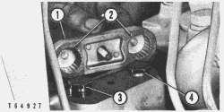 1. Cover. 2. Retaining holes. 3. High idle adjusting screw. 4. Low idle adjusting screw.