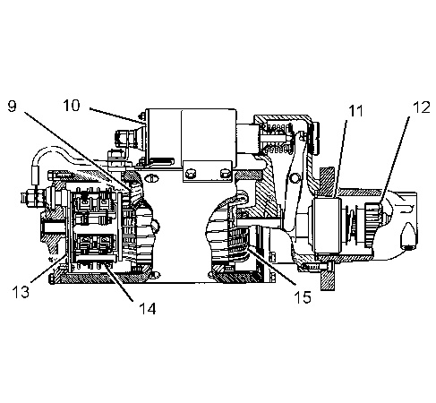 Typical starting motor components (9) Field (10) Solenoid (11) Clutch (12) Pinion (13) Commutator (14) Brush assembly (15) Armature |