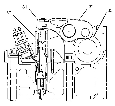 Electronic unit injector mechanism (30) Electronic unit injector (31) Adjusting nut (32) Rocker arm assembly (33) Camshaft lobe |
