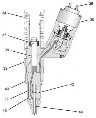 Electronic unit injector (34) Spring (35) Solenoid connection to the Electronic Control Module (ECM) (36) Solenoid valve assembly (37) Plunger assembly (38) Barrel (39) Seal (40) Seal (41) Spring (42) Spacer (43) Body (44) Check valve |