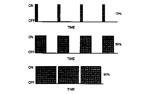 Pulse Width Modulation (PWM) – The PWM is a signal that consists of pulses that are of variable width. These pulses occur at fixed intervals. The ratio of “TIME ON” versus total “TIME OFF” can be varied. This ratio is also referred to as a duty cycle.
