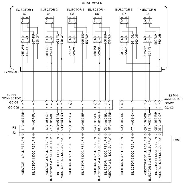 Note: Refer to the following schematic. Two injector solenoids share a common supply wire. For this reason, an open circuit or a short circuit in a supply wire could cause diagnostic codes for two cylinders.