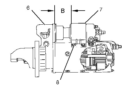 Check the distance (B) between the intermediate housing (6) and the solenoid mounting bracket (7) . Use calipers to check distance (B) .